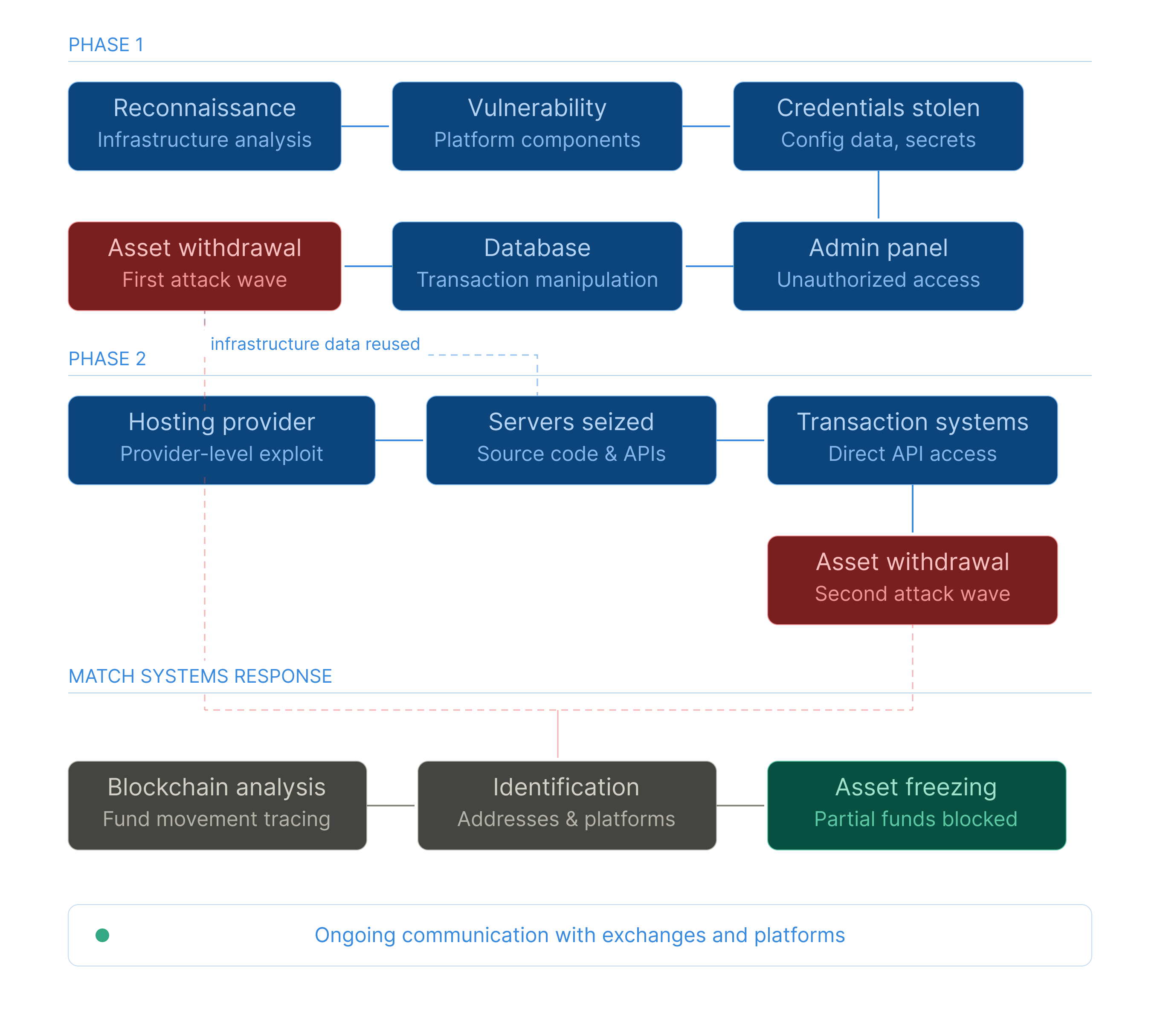 As part of the incident response, a comprehensive technical investigation was conducted, with the direct involvement of the Match Systems team. Specialists reconstructed the full attack chronology, established the compromise vectors, and identified the servers from which the malicious activity was carried out. At the same time, a detailed chain of movement of the stolen assets was constructed and subsequently tagged. A blockchain analysis allowed us to identify the withdrawal addresses and establish their links to specific services and platforms.